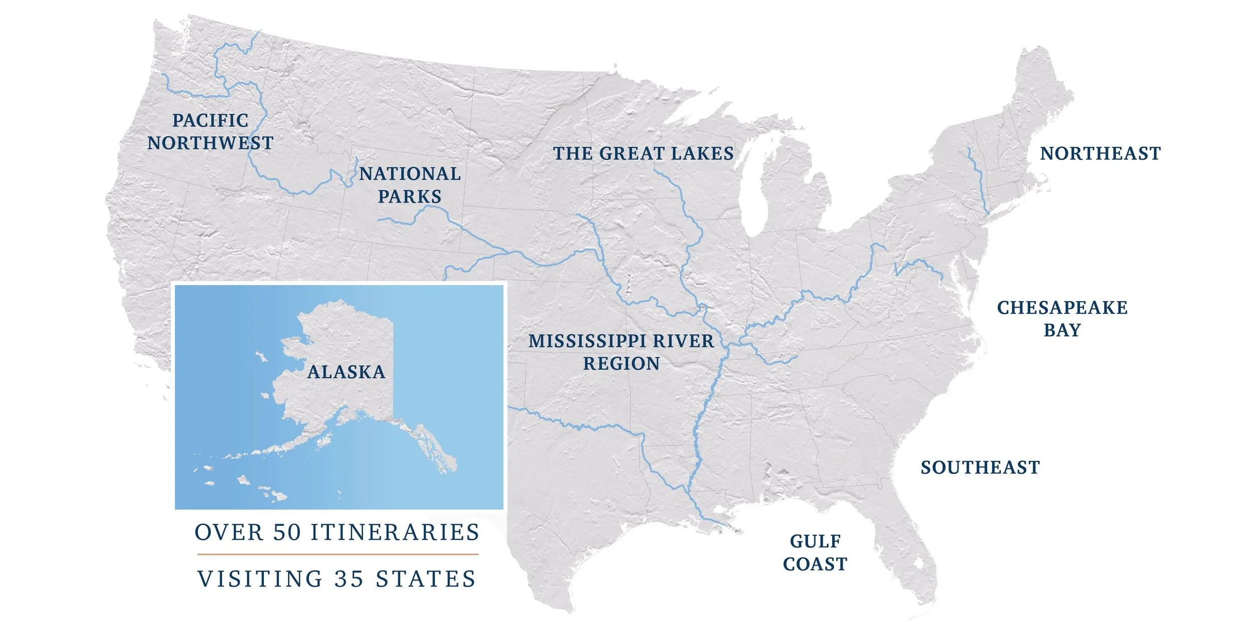 American Cruise Lines offers a variety of captivating cruise itineraries throughout the United States, including the Mississippi River region, Southeast, Northeast, Pacific Northwest, Alaska and the Great Lakes. Journey with us on America's original highways, discovering its rich history and breathtaking scenery from the unique perspective of our modern riverboats, classic paddlewheelers, and small coastal ships.